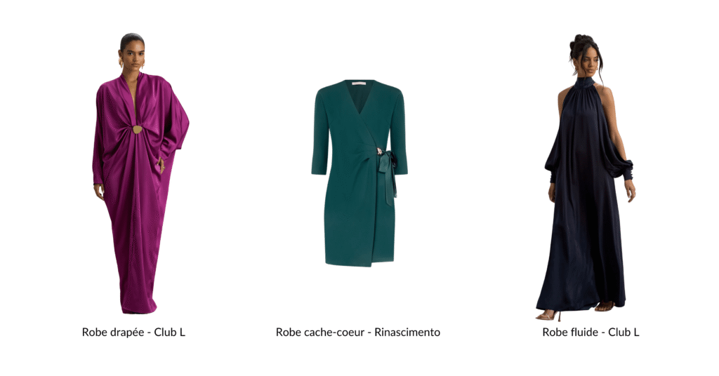 La robe portefeuille, la robe droite, la robe taille empire, la robe fluide créent de la verticalité et une silhouette équilibrée.