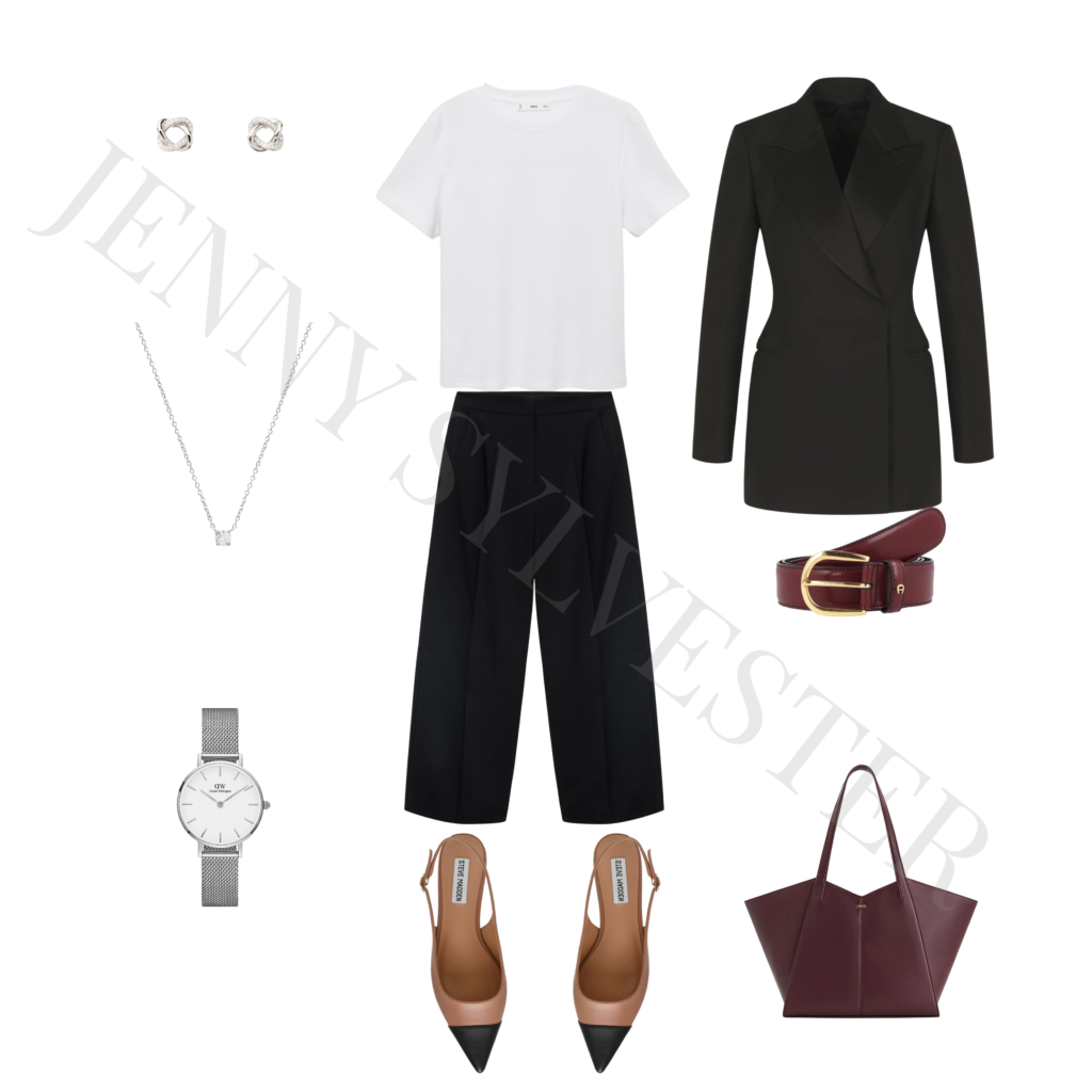 Nous avons d’abord clarifié l’image qu’elle voulait projeter : compétente et fiable. Le test de style a révélé une base décontractée et élégante, que nous avons structurée pour lui donner plus de présence.