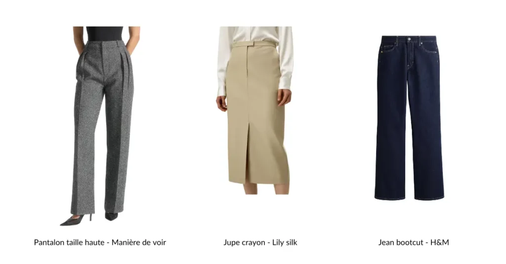 À éviter : pantalons taille basse ou coupe trop droite qui aplatisse la taille.