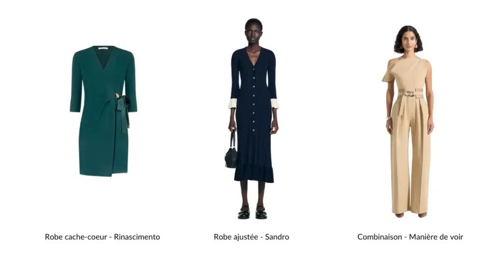 - Préférer des robes portefeuille ou fourreau qui dessinent joliment la ligne du corps et créent un look élégant.