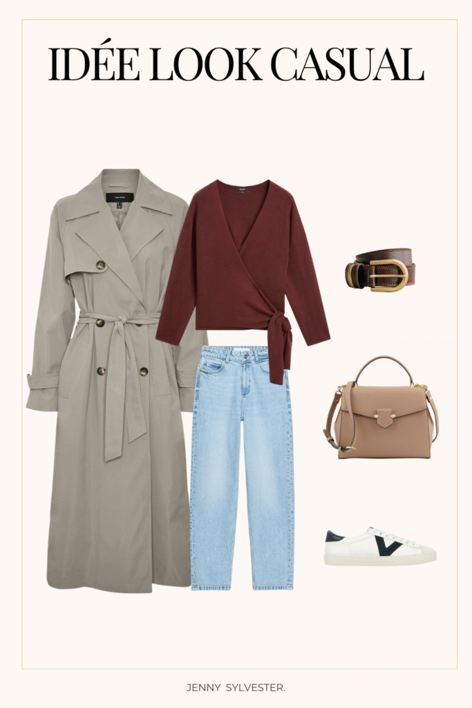 - Trench camel + jean slim + escarpins neutres.